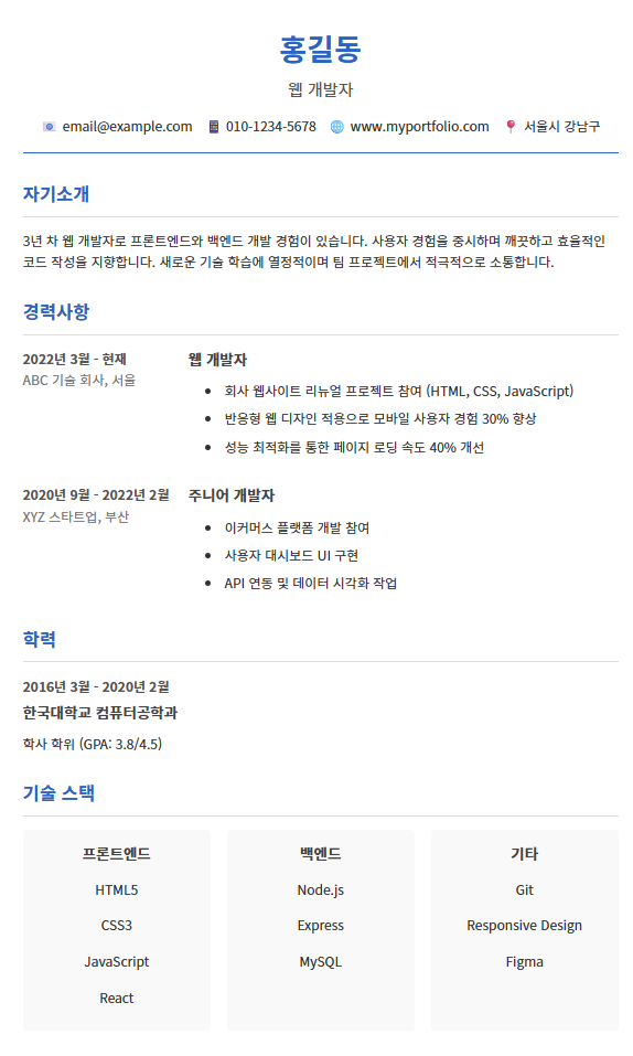 위의 모든 CSS 코드를 style.css 파일에 추가한 후 브라우저에서 resume.html 파일을 열어보세요. 스타일이 적용된 전문적인 이력서 페이지를 확인할 수 있습니다.